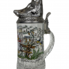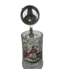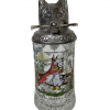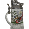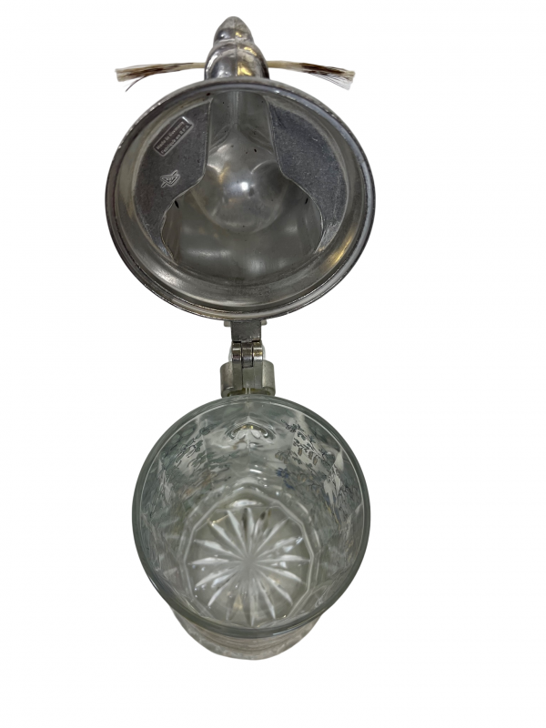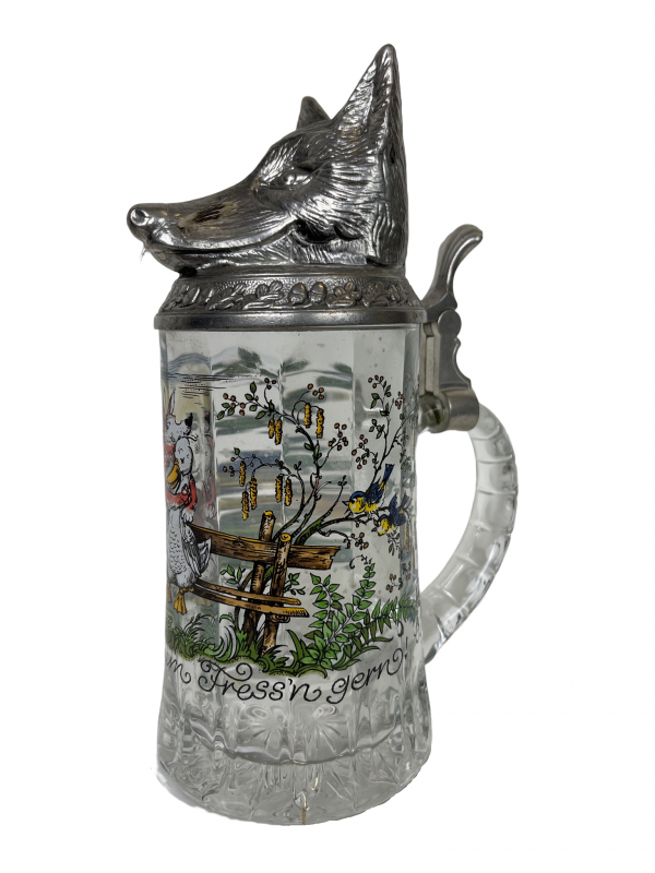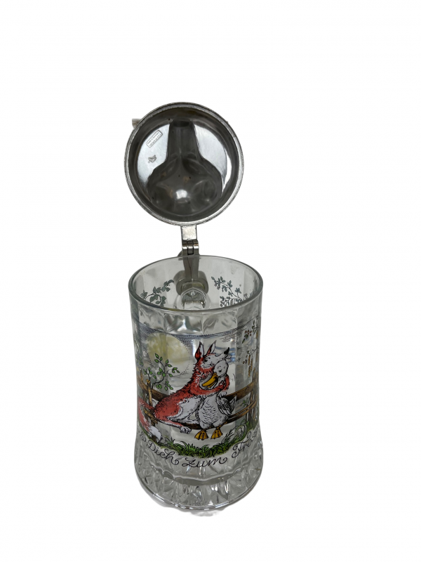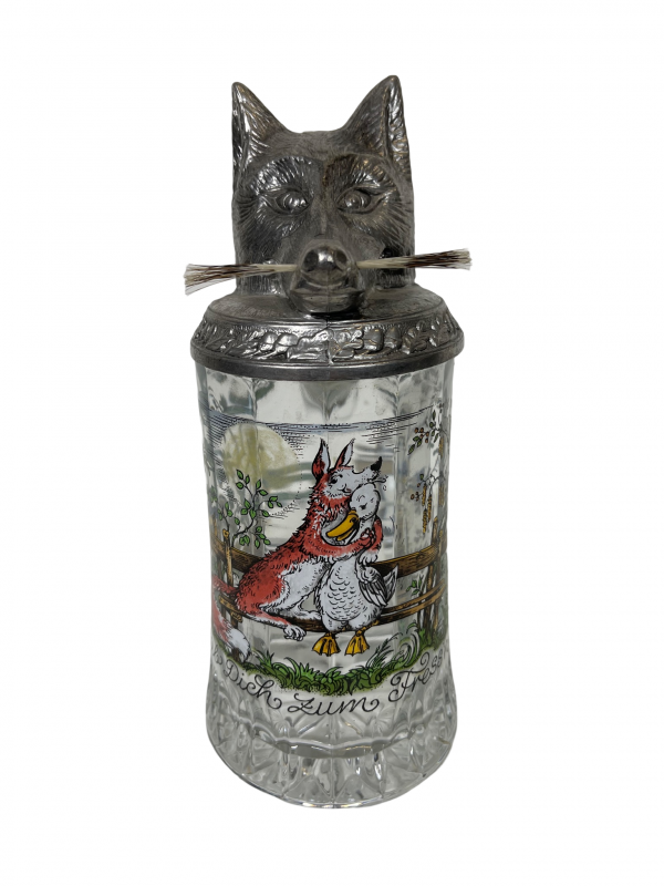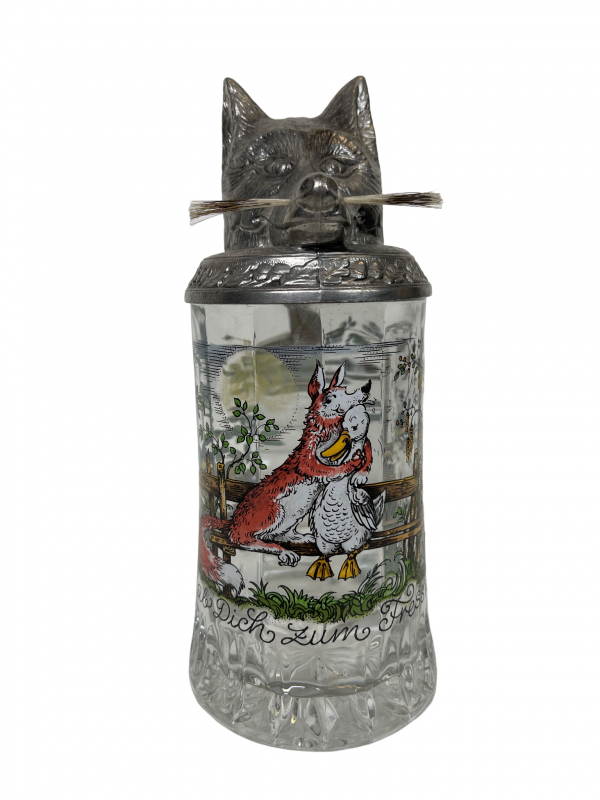 Dieser Bierkrug aus Glas mit einem Zinndeckel in Form eines Fuchses ist ein einzigartiges und dekoratives Stück, das oft von Bierliebhabern und Sammlern geschätzt wird. Der Krug besteht aus klarem Glas mit detailreicher, handbemalter Zeichnung mit humorvollem Spruch, ebenfalls handgemalt. Der Henkel hat eine geriffelte Oberfläche für einen sicheren Griff. Der Zinndeckel ist in Form eines Fuchskopfes gestaltet und dient als Verschluss des Kruges. Der Fuchs ist detailliert ausgearbeitet und hat eine realistische Optik, die das Design des Kruges noch interessanter macht. Bierkrüge mit Zinndeckeln sind traditionelle Bierkrüge, die oft mit speziellen Anlässen oder Veranstaltungen in Verbindung gebracht werden. Ein Bierkrug mit einem Fuchsdeckel ist ein auffälliges und einzigartiges Stück, das sowohl als dekoratives Element als auch zur praktischen Verwendung beim Genuss von Bier genutzt werden kann.