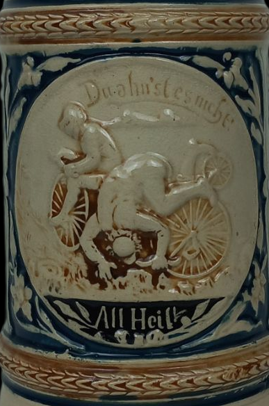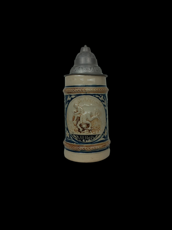Dieser wunderbare Bierkrug besteht aus Keramik und wurde um 1950 in Deutschland handgefertigt. Er zeichnet sich besonders durch seine kontrastierenden Farben und seiner besonders schönen Prägung aus. Zu sehen ist die Aufschrift „Du ahn’st es nicht: All Heil!“. All Heil war der Gruß der bürgerlichen Fahradfahrers des 18. und 19. Jahrhunderts. Somit ist dieser Krug nicht nur ein perfektes Geschenk für einen Bierliebhaber, sondern auch für jemanden, der gerne nach einer anstrengenden Radtour ein kühles Bier genießen möchte.