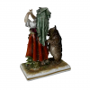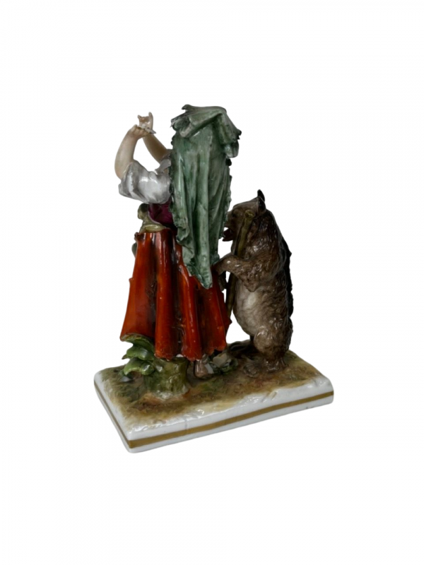 Die Porzellanfigur zeigt Rotkäpchen, wie sie in ihrem roten Umhang durch den Wald spaziert. Die Figur ist äußerst detailreich gestaltet und zeigt fein ausgearbeitete Gesichtszüge und Kleidungsdetails. Das Kleid hat eine leuchtend rote Farbe, während das Gesicht und die Hände des Charakters realistisch und natürlich aussehen.