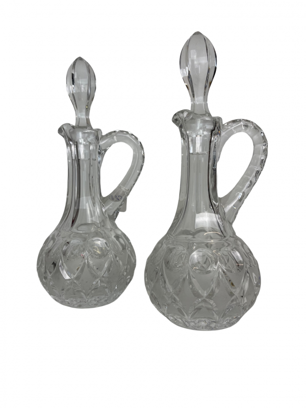 Die Karaffen sind wahrscheinlich mundgeblasen, von Hand geschliffen und haben eine klassische Form, sind schlank und elegant mit einem geschwungenen Hals und einem breiteren Boden. Sie sind für Spirituosen oder Liköre konzipiert und haben eine Fassungsvermögen von ca. 0,5 Liter.